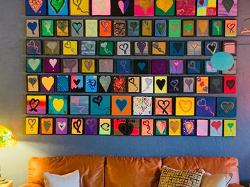 For those of you that reached out regarding the 'Wall of Love' I am happy to give you a price if you give me dimensions for the area that you are looking to create the same look. This design is 5 ft x 7 ft. We used 3 different size canvases. Will also include supplies for the young family members to create hearts too!